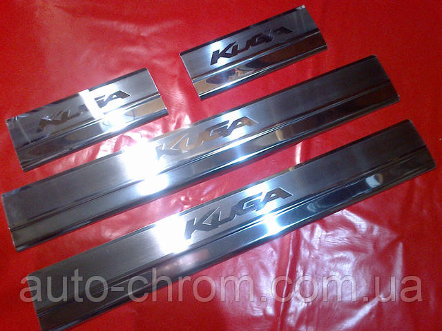 Накладки на пороги Ford Kuga захищають кузов вашого авто від механічних пошкоджень (удару ногою, підбором тощо). Також накладки нададуть вашому авто стильний вигляд. Накладки на пороги для Форд Куга виготовлені з полірованої неіржавкої сталі, встановлюються на двосторонній скотч.